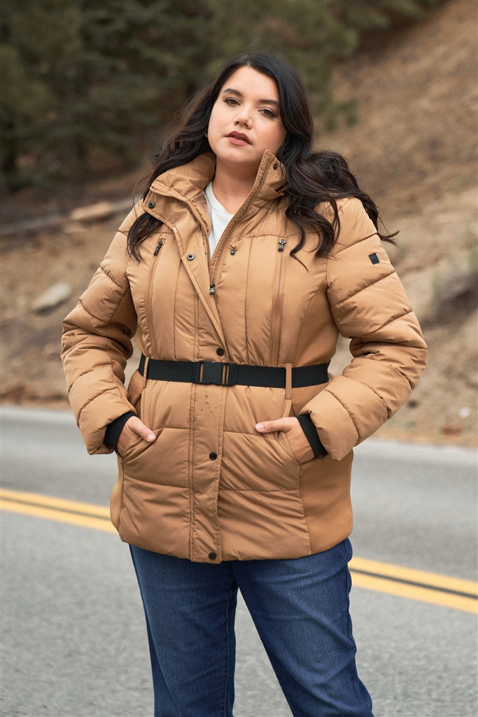 Plus Faux Fur Harness Buckle Belt Detail Long Fitted Puffer Jacket