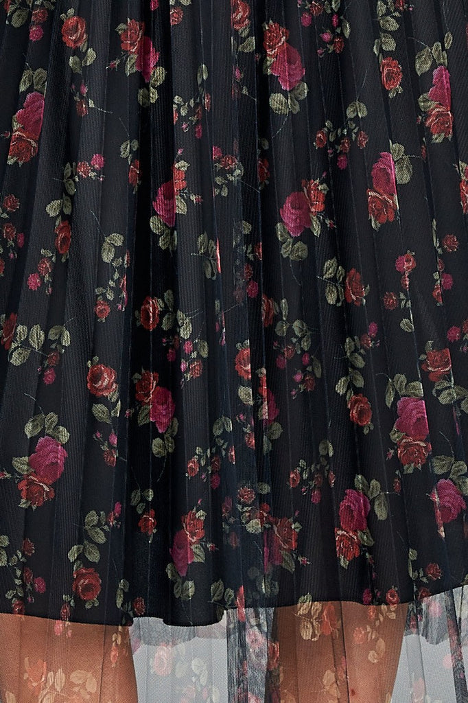 Ladies fashion elastic waist band w/accordian pleated floral print mesh midi skirt