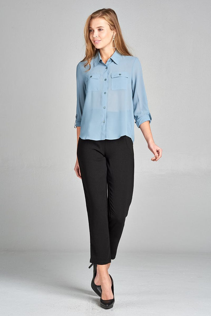 Ladies fashion long sleeve front pocket chiffon blouse w/ back button detail