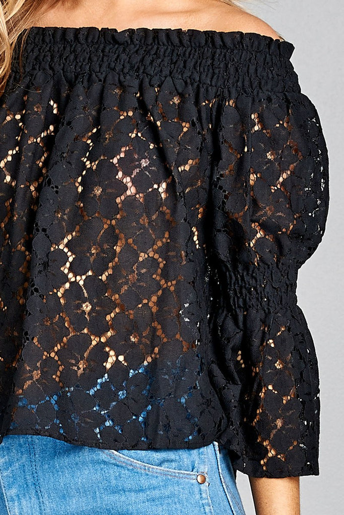 Ladies fashion off the shoulder w/smocked detail floral lace top