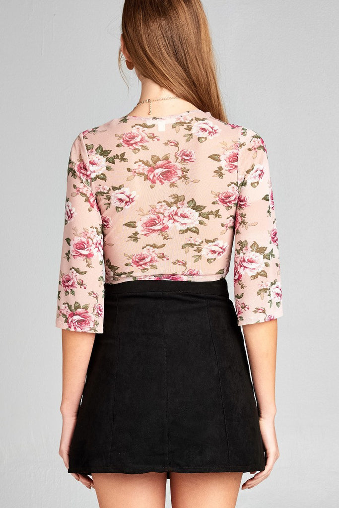 Ladies fashion elbow bell sleeve open front self tie floral print mesh crop top
