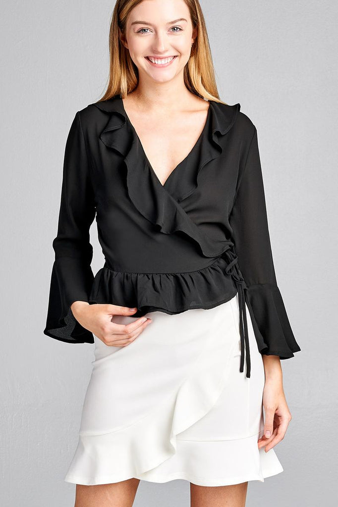 Ladies fashion 3/4 bell sleeve wrap w/ruffle side tie closure flare bottom wool dobby woven top