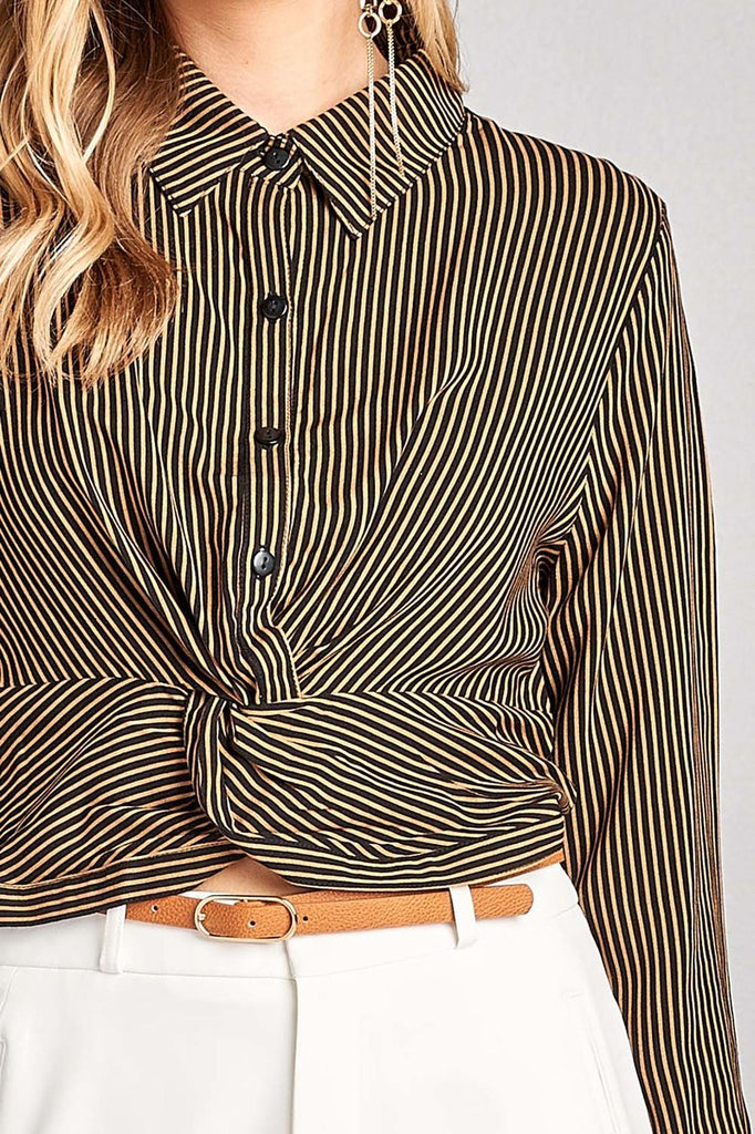 Ladies fashion long sleeve front knot w/button stripe rayon challis woven top