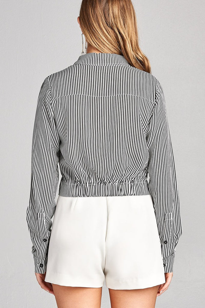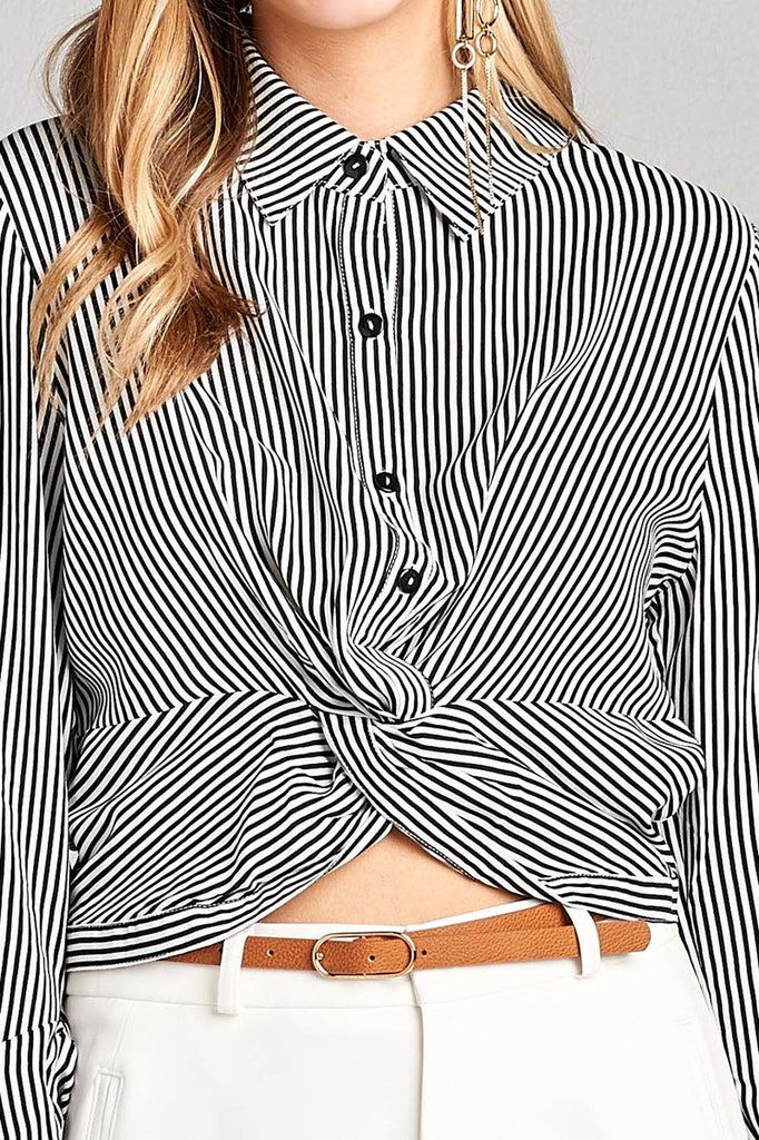 Ladies fashion long sleeve front knot w/button stripe rayon challis woven top