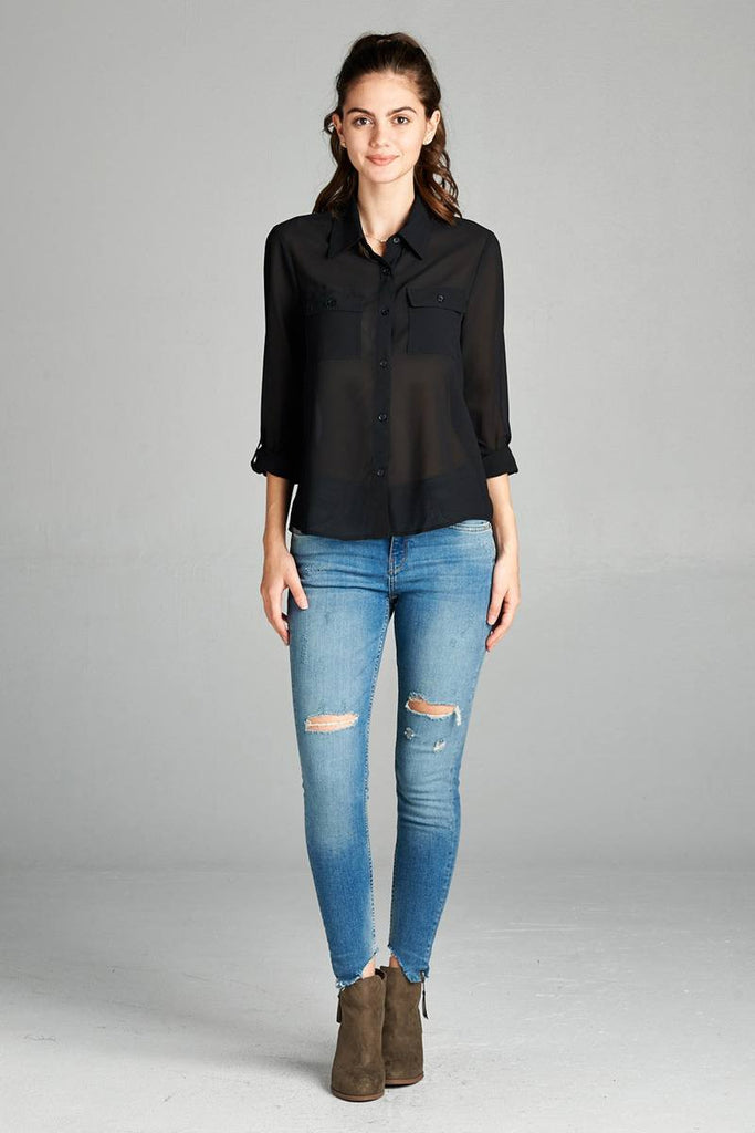 Ladies fashion plus size long sleeve front pocket chiffon blouse w/black button detail