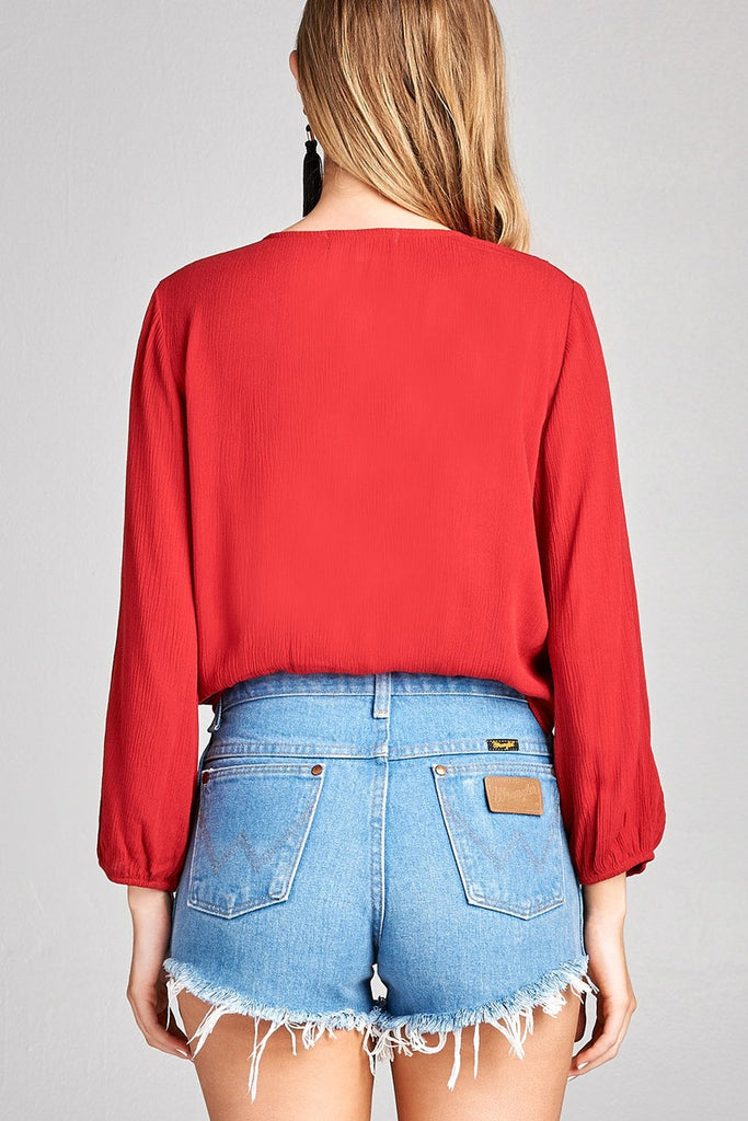 Ladies fashion plus size 3/4 sleeve crochet lace trim w/lace up crinkle gauze woven top