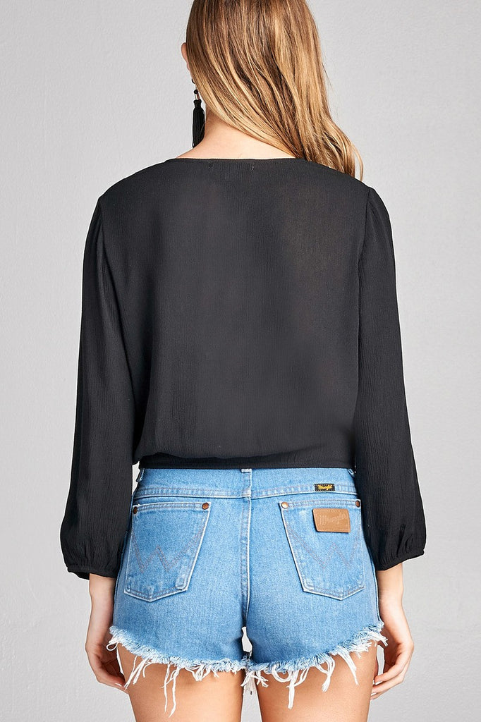 Ladies fashion plus size 3/4 sleeve crochet lace trim w/lace up crinkle gauze woven top