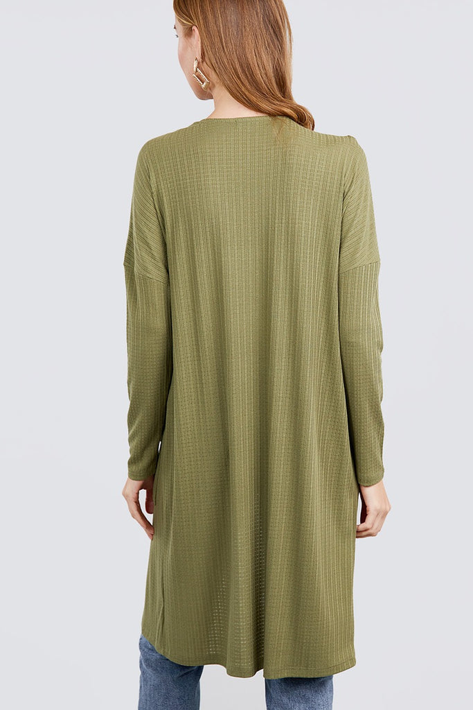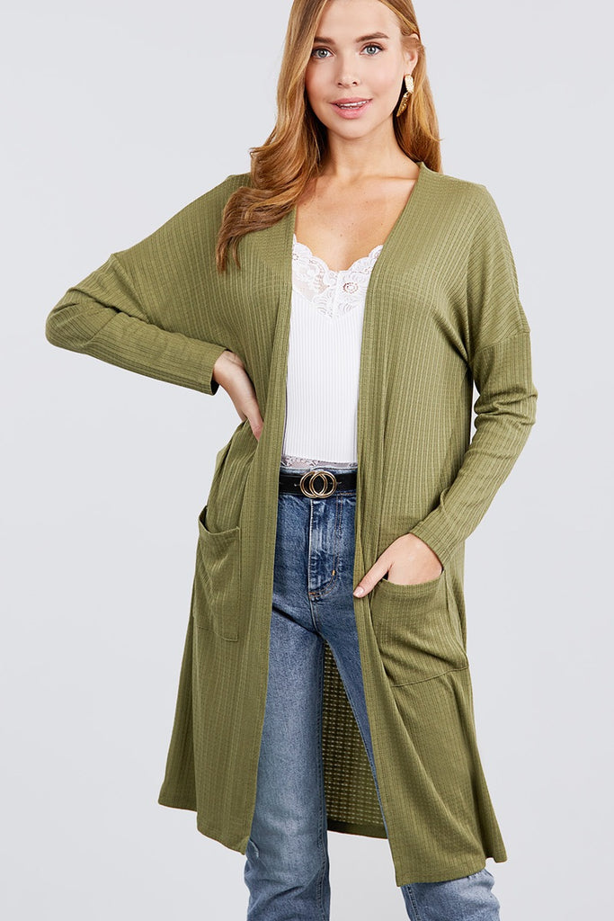 Long Dolman Sleeve Open Front W/pocket Pointelle Rib Long Cardigan