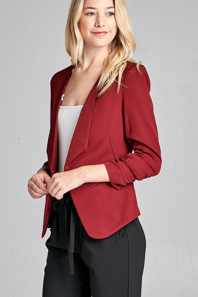 Ladies fashion 3/4 shirring sleeve open front woven jacket