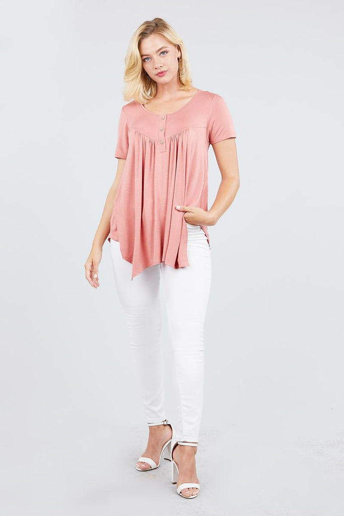 Short Sleeve Scoop Neck W/button Shirring Detail Rayon Spandex Top
