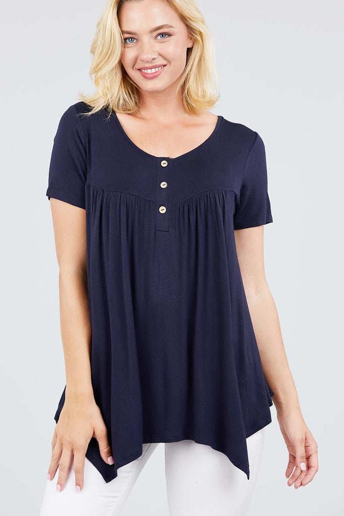 Short Sleeve Scoop Neck W/button Shirring Detail Rayon Spandex Top