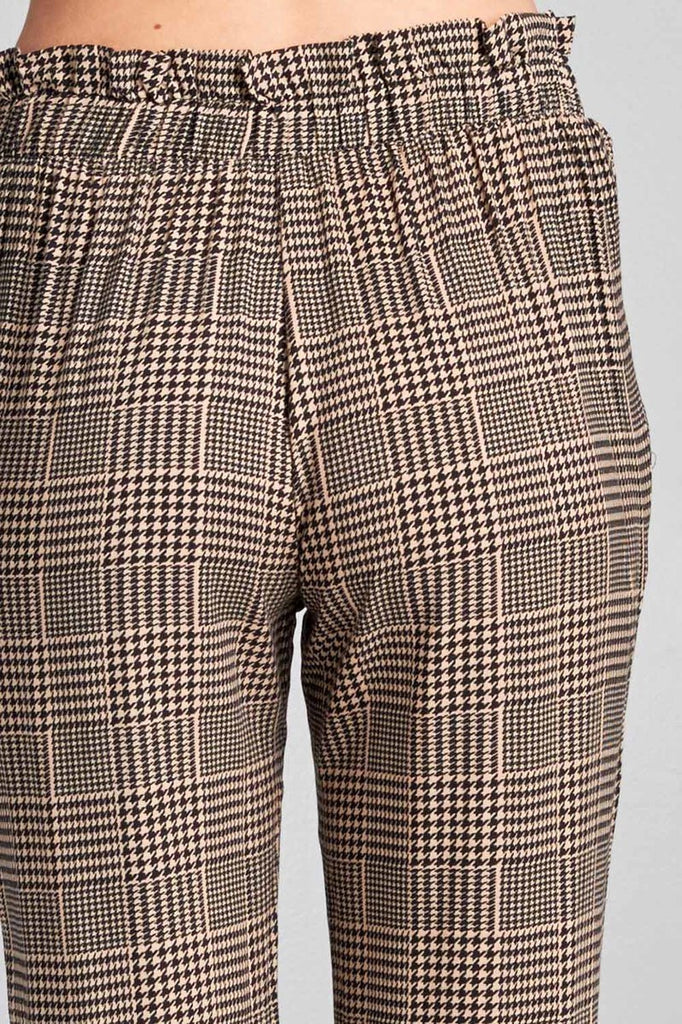 LADIES FASHION PLUS SIZE SELF RIBBON DETAIL LONG LEG CHECKED PRINT WOVEN PANTS