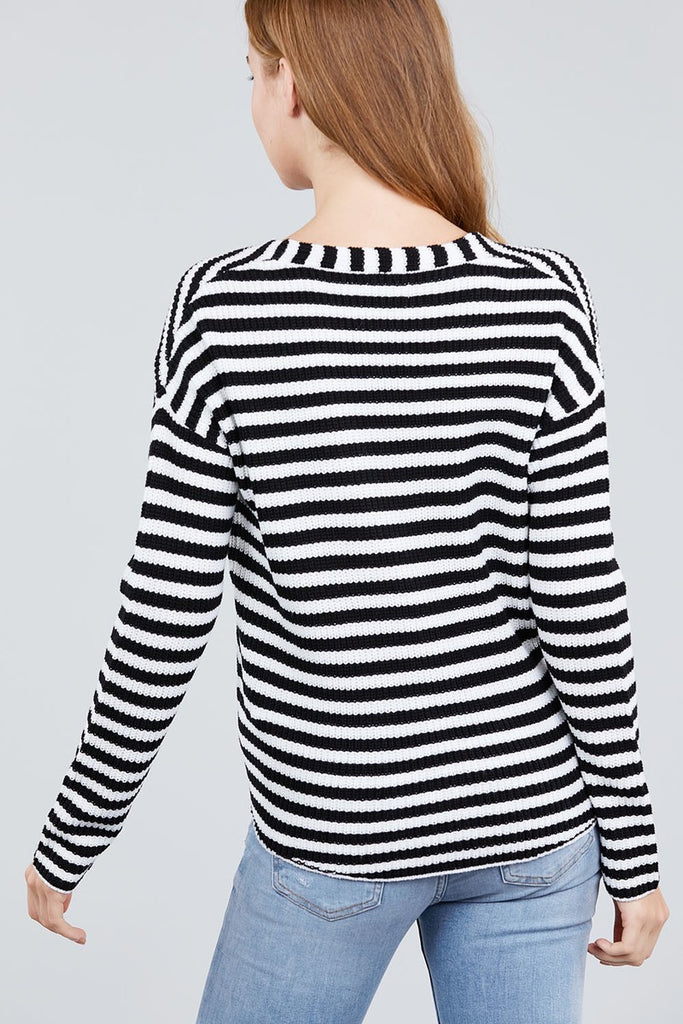 LONG SLEEVE V-NECK w/BUTTONED DOWN FRONT TIE STRIPE CARDIGAN
