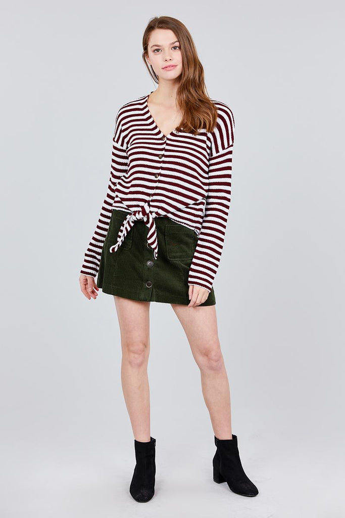 Long Sleeve V-neck W/buttoned Down Front Tie Stripe Cardigan