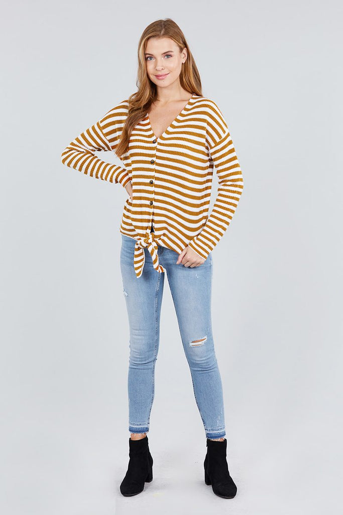 LONG SLEEVE V-NECK w/BUTTONED DOWN FRONT TIE STRIPE CARDIGAN