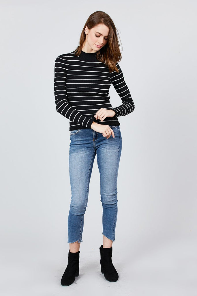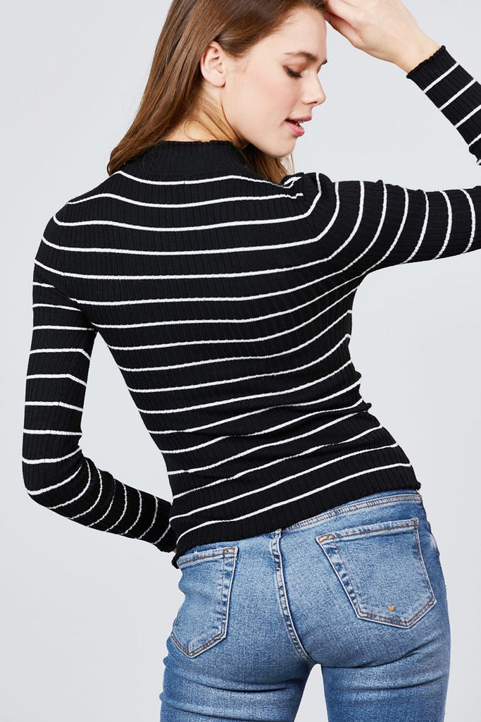 LONG SLEEVE MOCK NECK STRIPE RIB SWEATER TOP