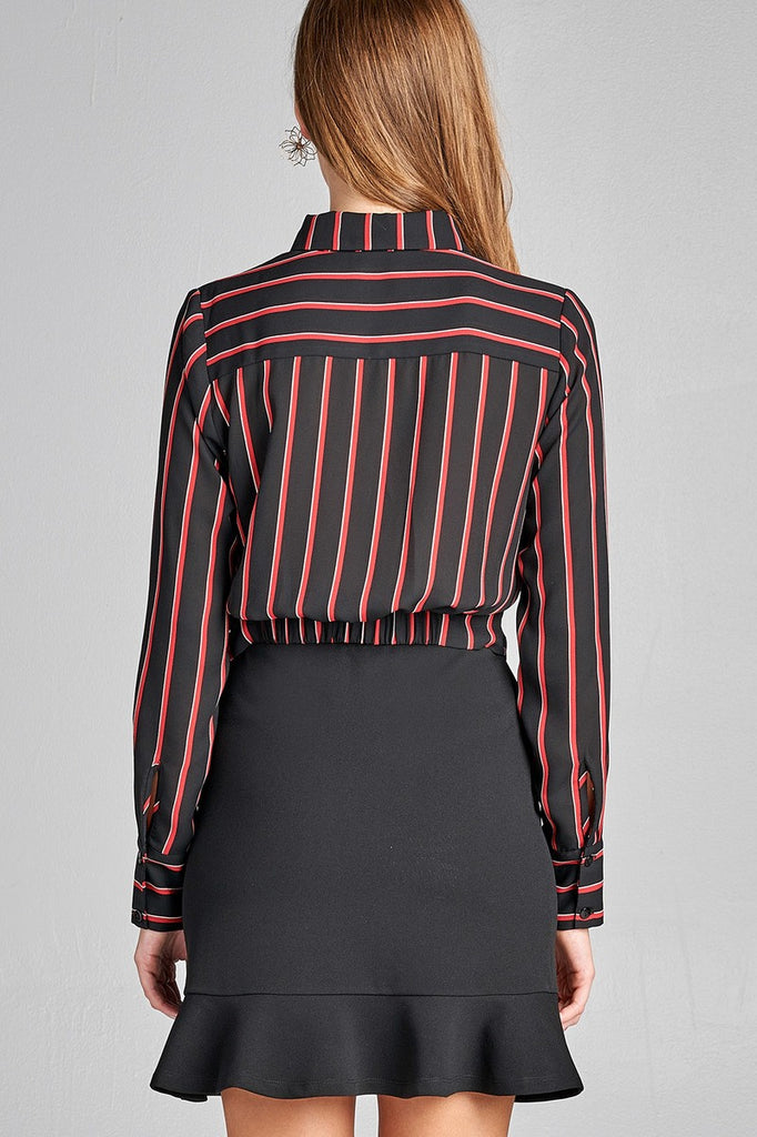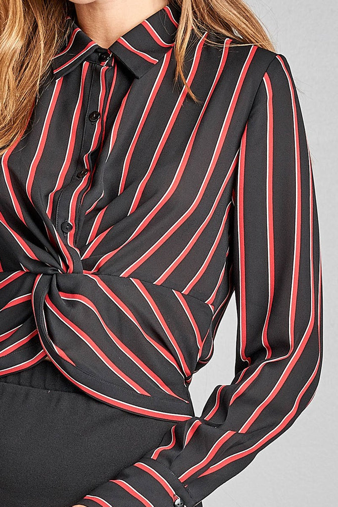 Ladies fashion long sleeve front button w/twisted detail stripe print woven shirt