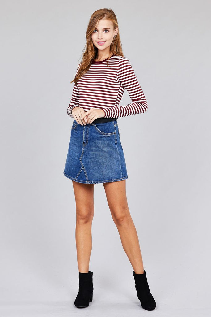 Ladies fashion long sleeve crew neck striped dty brushed top