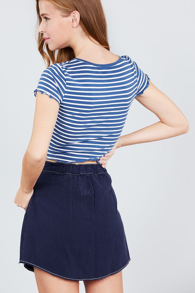 Short Sleeve Round Neck Lettuce Hem Stripe Jersey Cotton Spandex Top