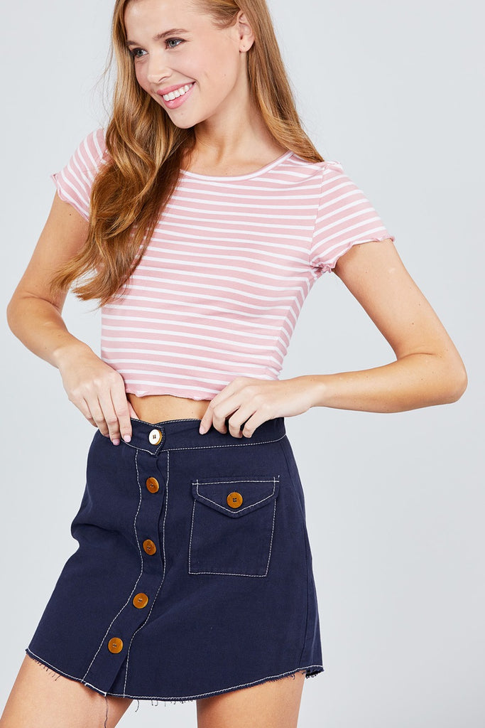 SHORT SLEEVE ROUND NECK LETTUCE HEM STRIPE JERSEY COTTON SPANDEX TOP