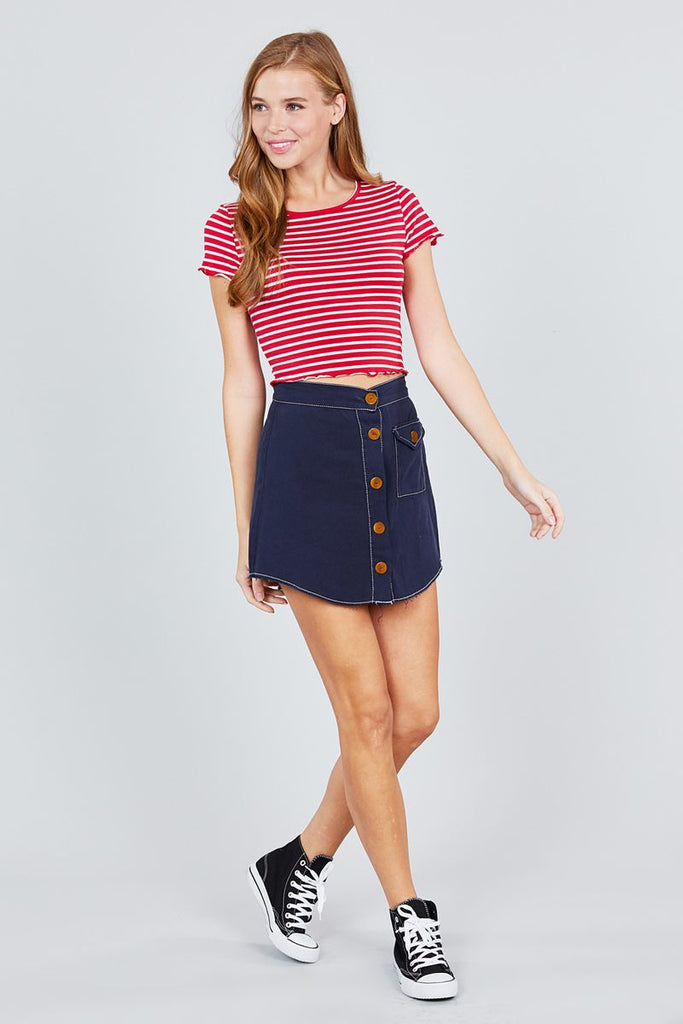 SHORT SLEEVE ROUND NECK LETTUCE HEM STRIPE JERSEY COTTON SPANDEX TOP