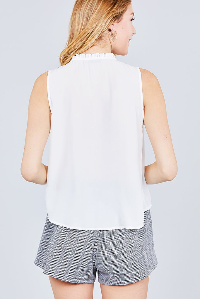 Sleeveless Ruffle Neck W/self Tie Smocked Yoke Detail Front Button Woven Top