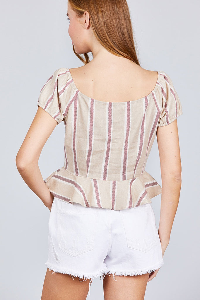 Short Sleeve Button Down Ruffle Hem Print Linen Woven Top
