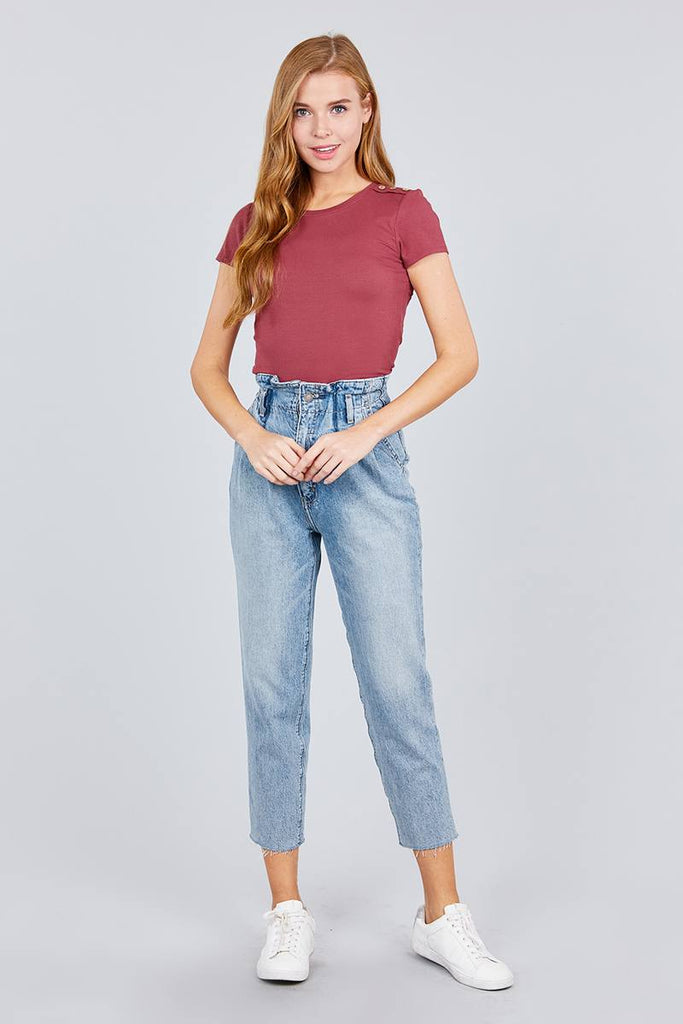 SHORT SLEEVE ROUND NECK w/SHOULDER BUTTON DOWN RAYON SPANDEX RIB KNIT TOP