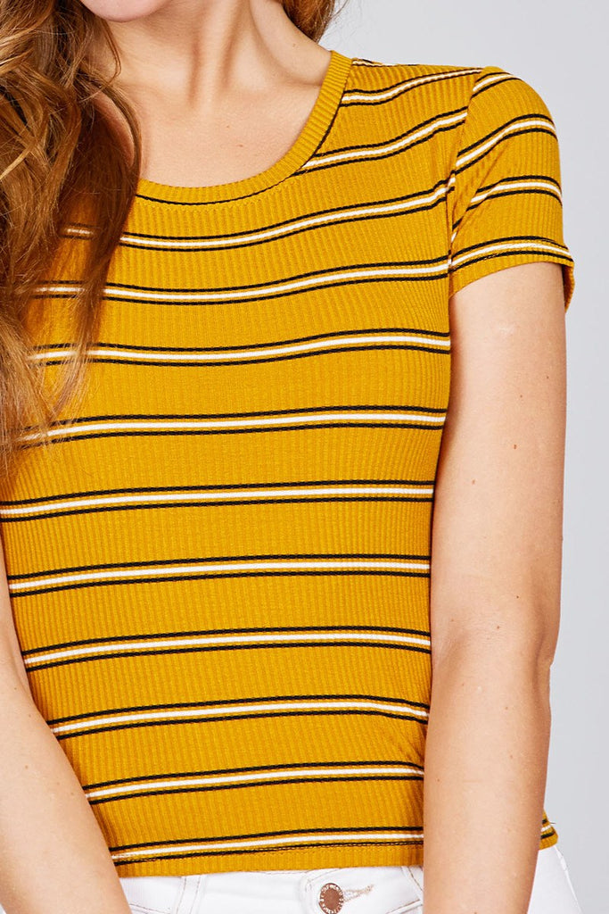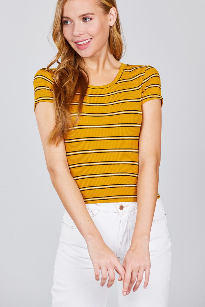 Short Sleeve Round Neck Multi Stripe Rib Knit Top