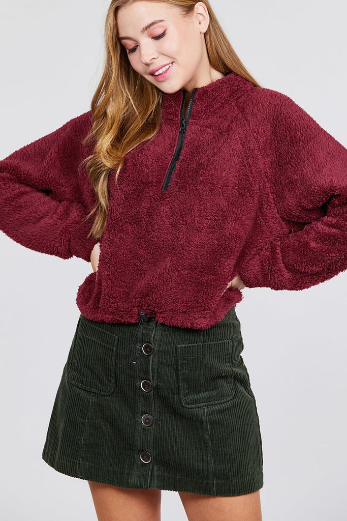 Long Dolman Sleeve Mock Neck W/zipper Detail Toggle Elastic Hem Faux Fur Top