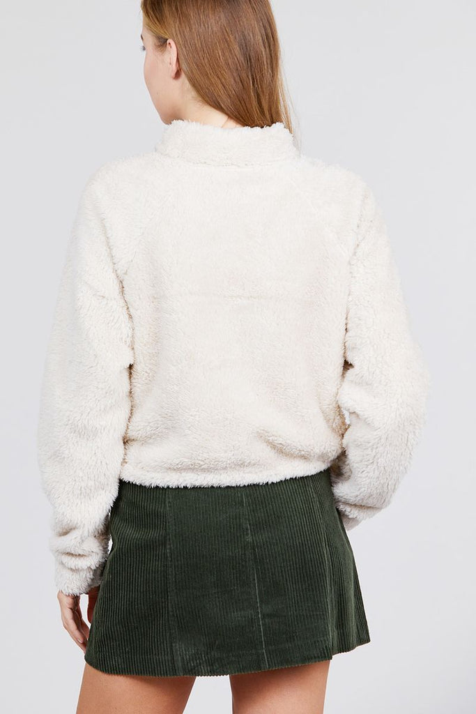 Long Dolman Sleeve Mock Neck W/zipper Detail Toggle Elastic Hem Faux Fur Top