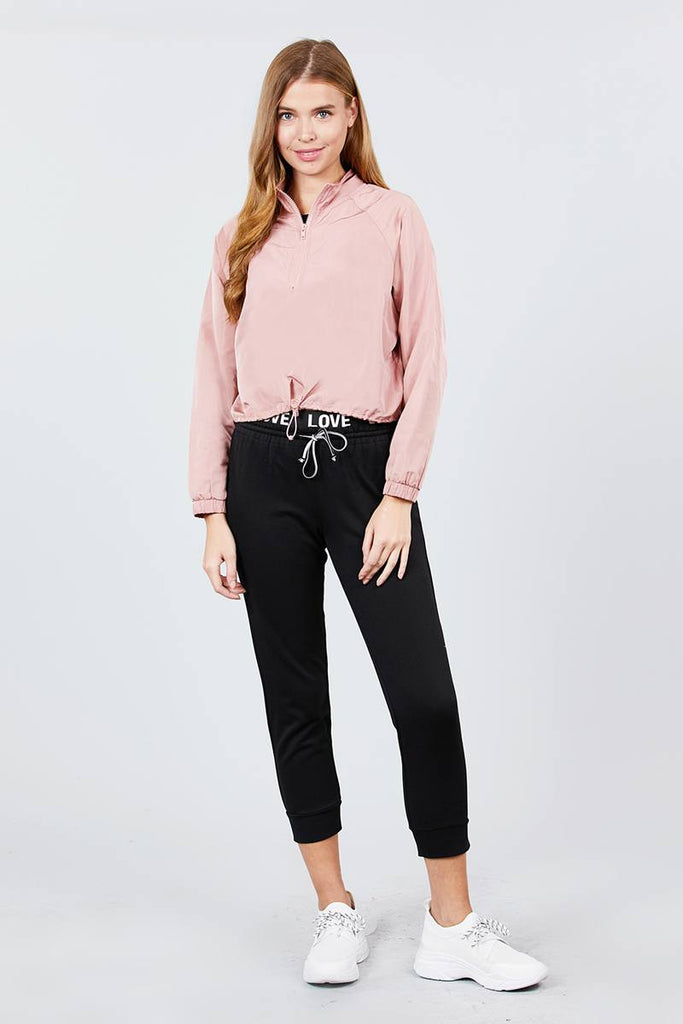 Long Raglan Sleeve Mock Neck Toggle Elastic Hem Wind Breaker Crop To