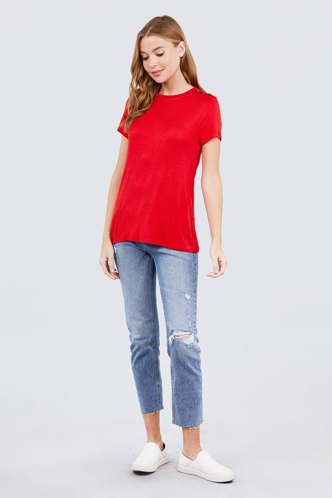 Short Sleeve Crew Neck W/shoulder Button Detail Rayon Spandex Top