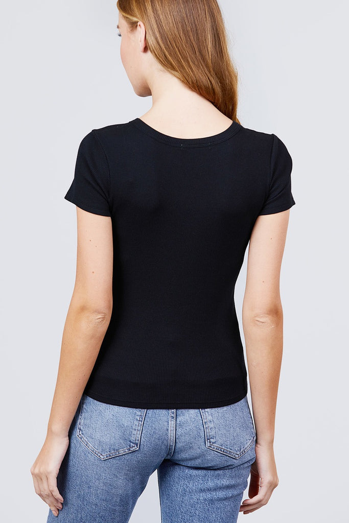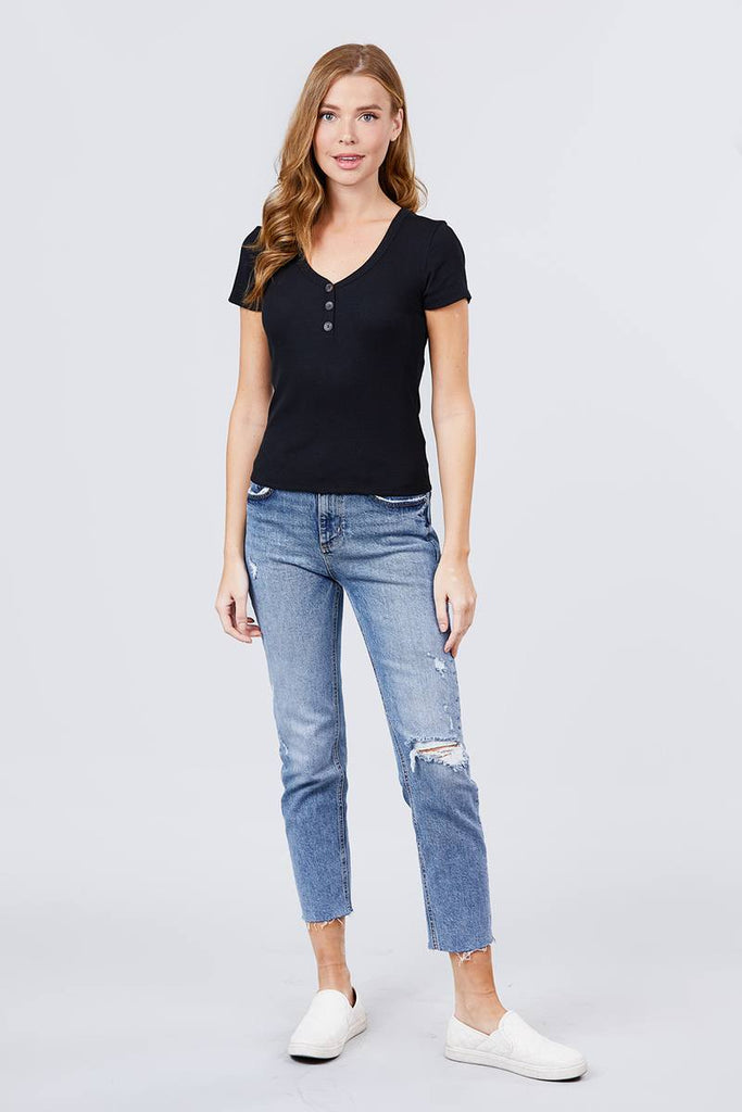 SHORT SLEEVE V-NECK w/BUTTON DETAIL RIB KNIT TOP