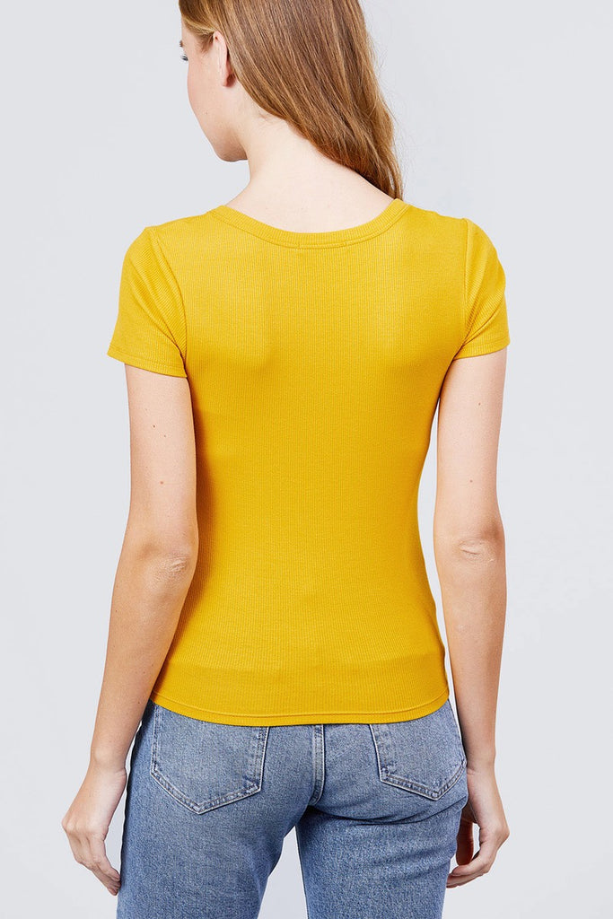 SHORT SLEEVE V-NECK w/BUTTON DETAIL RIB KNIT TOP