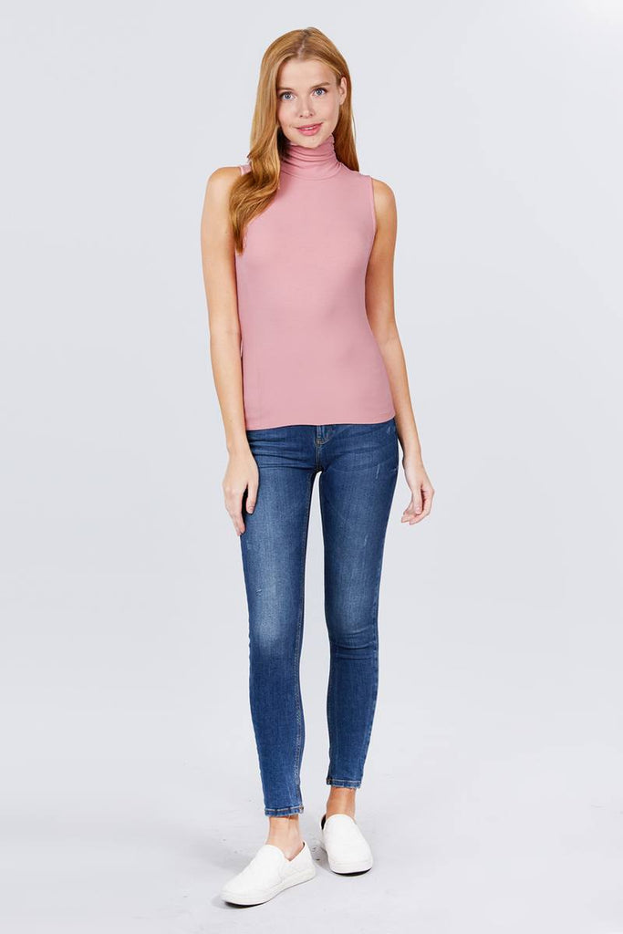 Sleeveless Shirring Turtle Neck Rib Knit Top