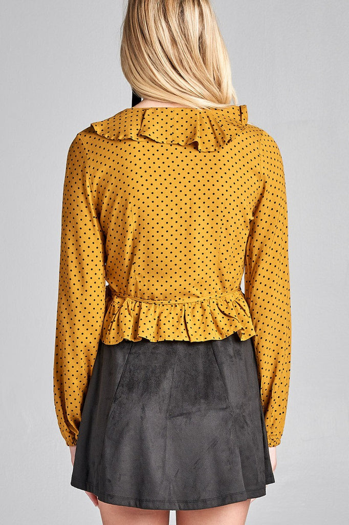 Ladies fashion long sleeve v-neck w/ruffle wrap side ribbon tie dot print woven top