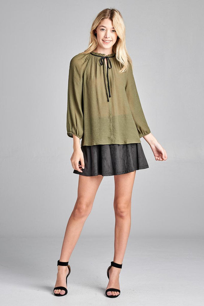 3/4 SLEEVE CONTRAST TIE FRONT BUTTON DETAIL SLUB GAUZE WOVEN TOP