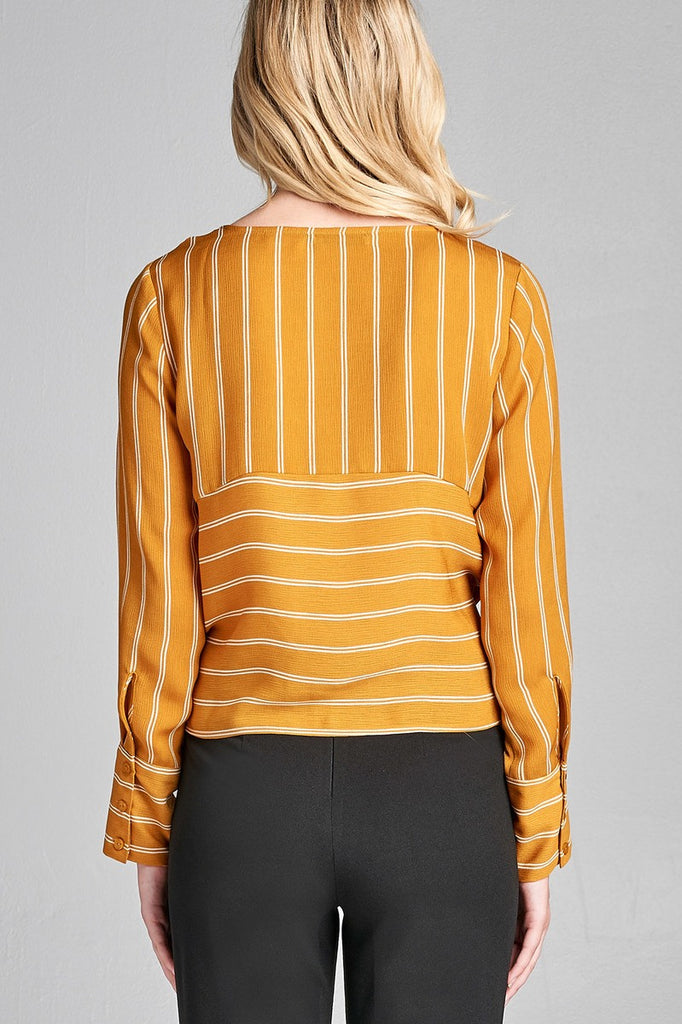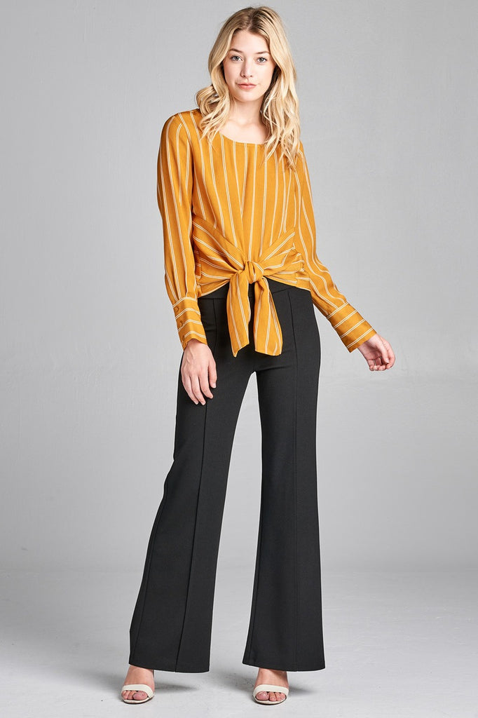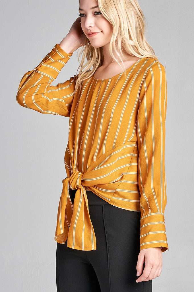 LADIES FASHION PLUS SIZE LONG SLEEVE ROUND NECK FRONT SELF TIE STRIPE PRINT WOVEN TOP