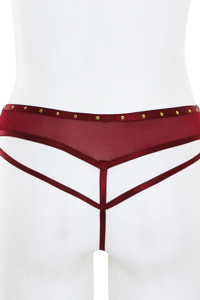 ImportedS.M.L.XLYoumita Open Cage Back Thong w/ Mesh Gold Metallic Stud DetailLace Sides Panels85% Nylon / 15% SpandexRhubarb BUL