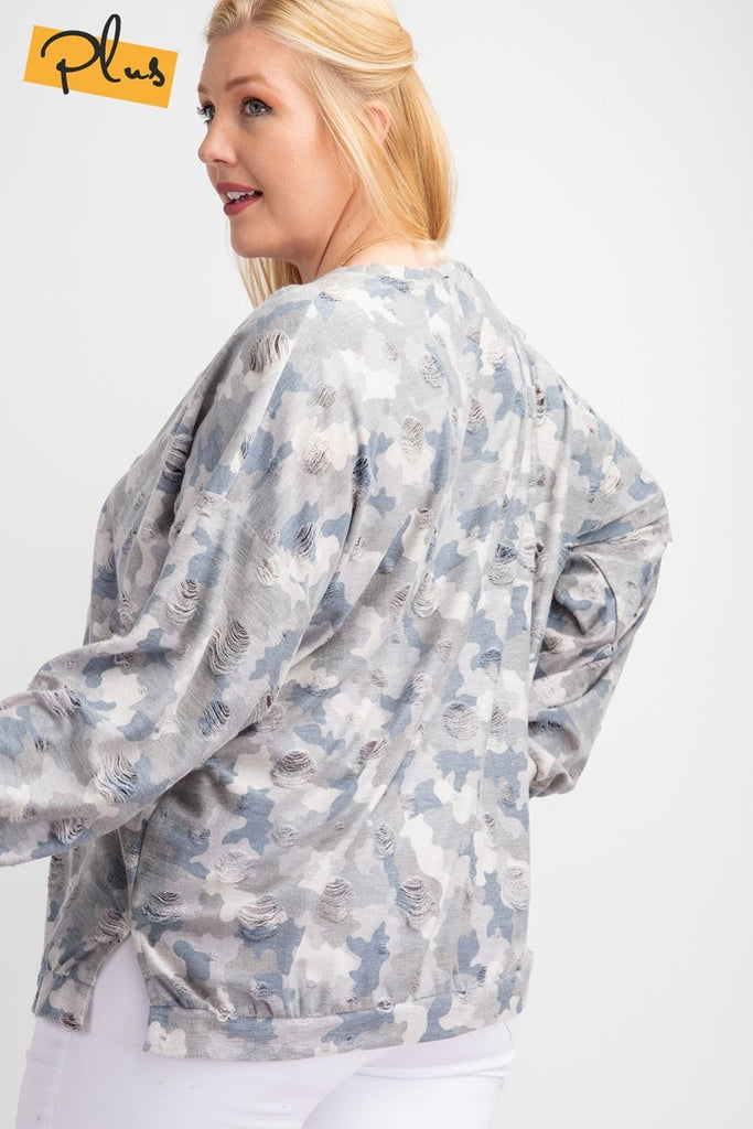 Plus Size Long Sleeve Distressed Printed Rayon Pullover Top