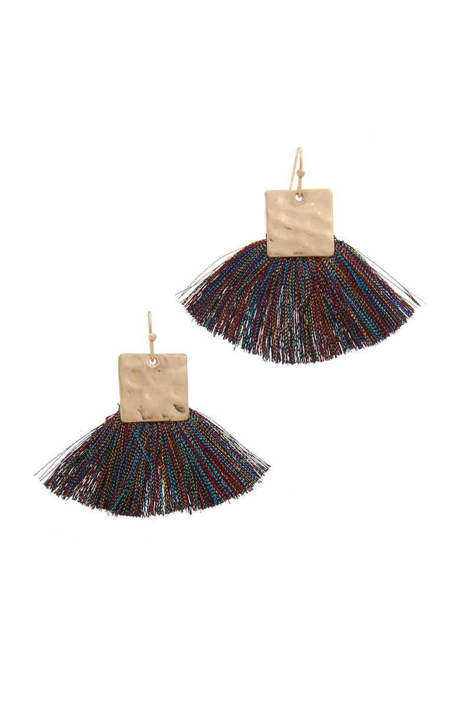 HAMMERED METAL SQUARE FAN TASSEL DROP EARRING