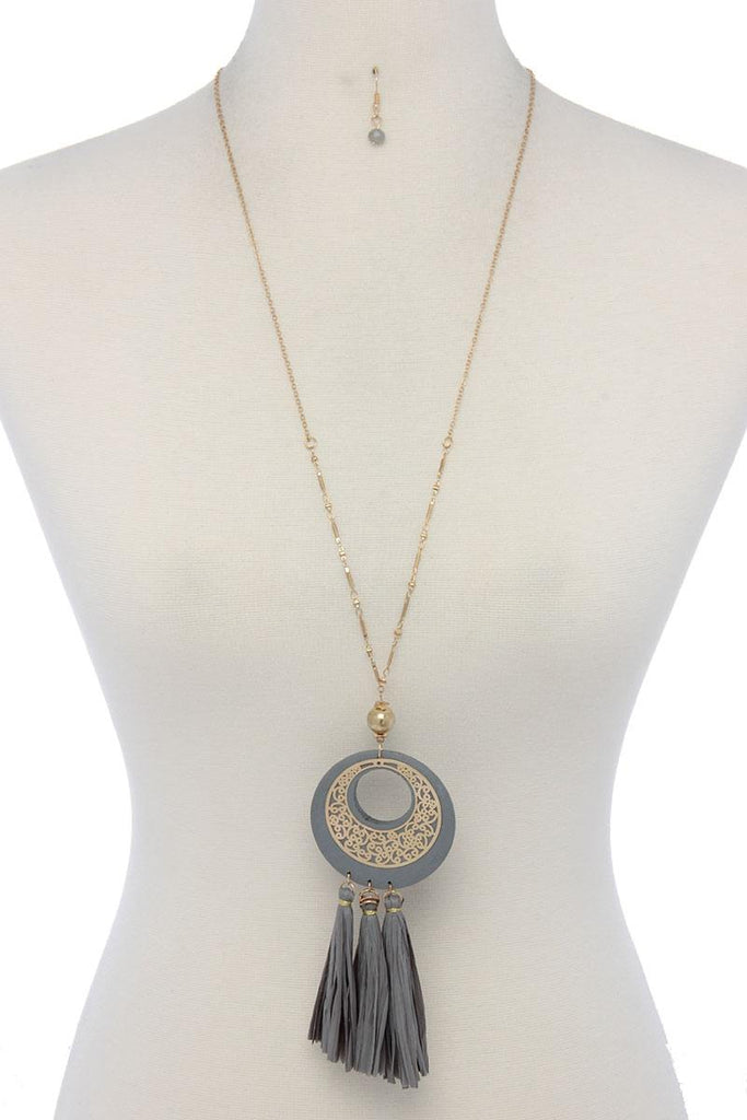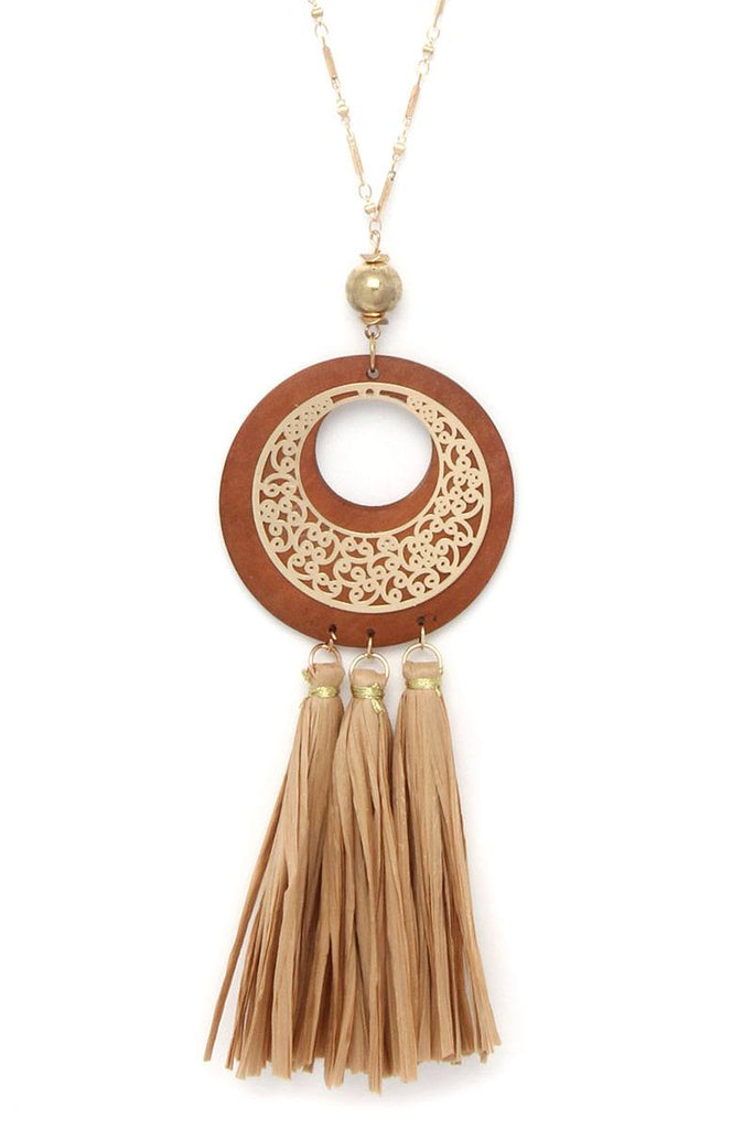 CUTOUT CIRCLE RAFFIA TASSEL PENDANT NECKLACE