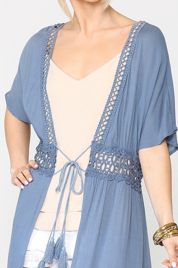 Lace Trim Open Front Tassel Waist Tie Duster Cardigan