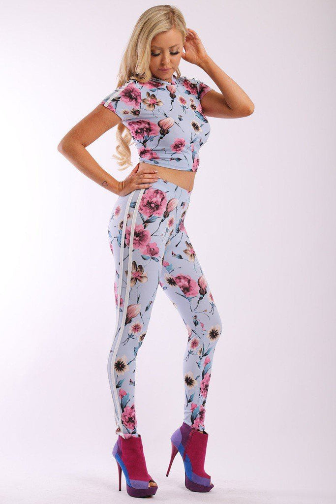 Floral Print And Striped Side Contrast 2 Pieces Set Includes A Hooded Cropped Top With Short Sleeves And A High Waist Full Leggings