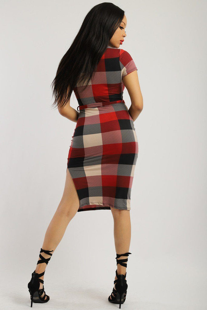 Plaid, midi tee dress with short sleeves, collared v neckline, decorative button, matching belt and a side slit.
