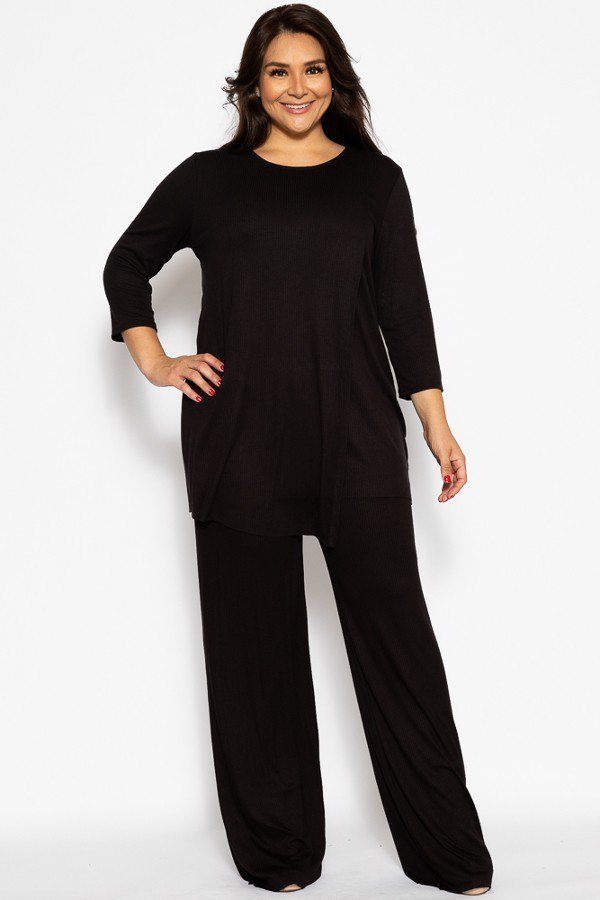 Comfy pleated 2 piece set made of a ribbed rayon fabric, featuring 3/4 sleeves, a layered detail front and breezy pants.