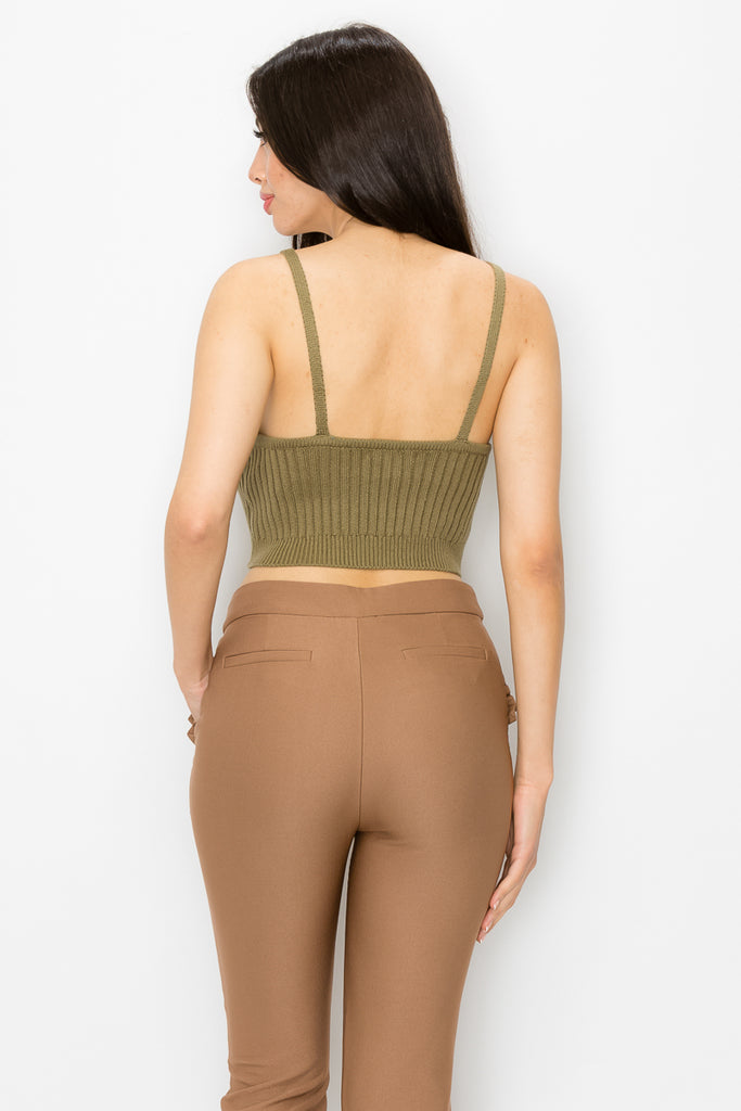 Imported S.M.L A ribbed sweater Sustainable Fashion tank top in a solid color featuring cami straps, a scoop neckline, a square cut-back, and a cropped hem. 52% Cotton 44% Acrylic 4% Elastane Olive IRI