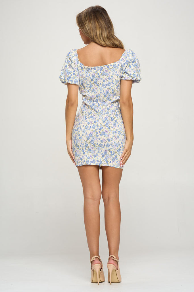 A floral-designed dress featuring an elasticized square neckline with self-tie ribbon, short puff sleeves with elasticized hem, bodycon silhouette, and mini length.