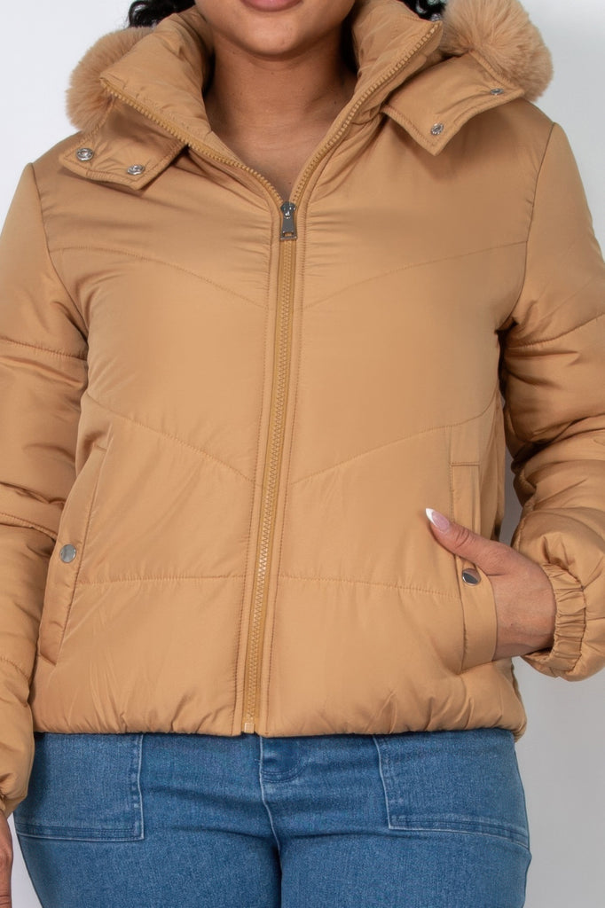Stay warm and stylish with our Insulated Zip-Up Faux Fur Hooded Jacket, designed for the urban trendsetter. This woven city luxe jacket in a rich khaki color seamlessly combines comfort and fashion.